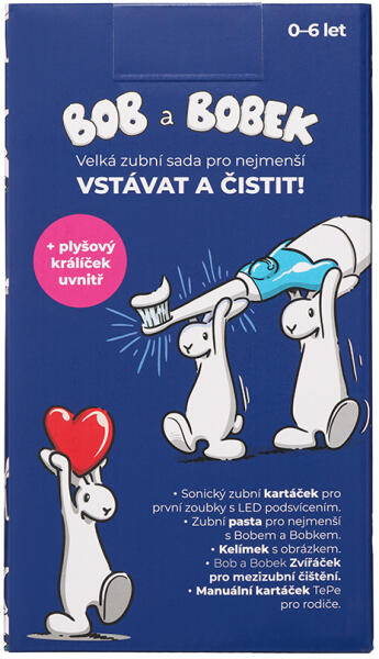 Bob és Bobek nagy fogászati készlet a kicsiknek: Kelj fel és mosd meg alaposan a fogacskáidat! A praktikus készlet szónikus fogkefét, fogmosópoharat, fogselymet, és egy ajándék kézi fogkefét tartalmaz. Mindezek mellett egy Bob és Bobek fogkrémet is tettünk a dobozba, hogy teljes körű ellátást biztosítsunk a kicsik tejfogainak 0-6 éves korig, valamint egy kis plüss nyuszit is elrejtettünk benne, a gyermekek nagy örömére. Az hogy Bob vagy Bobek lesz-e a szettben, a kis lurkó fantáziáján múlik. A BOB ÉS BOBEK BABY szónikus fogkefe 0-6 éves korú gyermekek számára ajánlott.